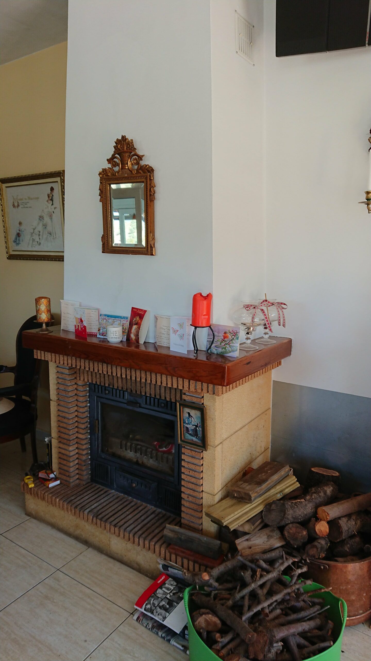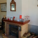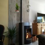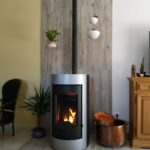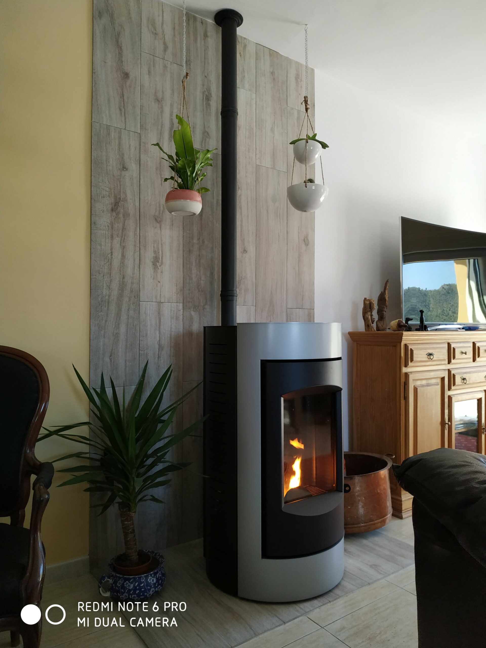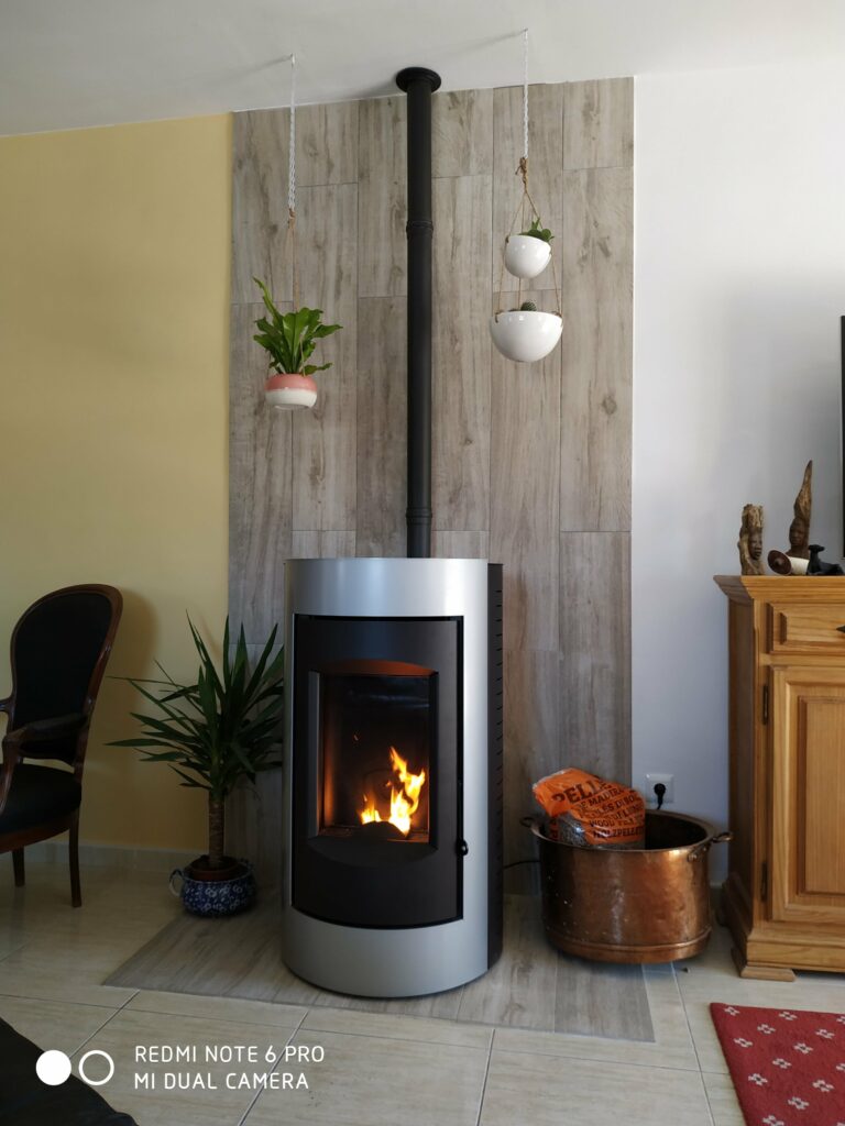 Sustitución de chimenea de leña por estufa de pellet con alicatado en la pared trasera.